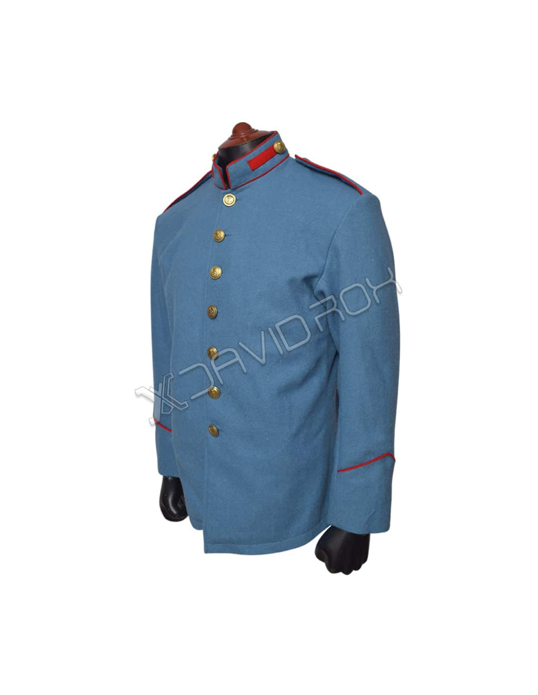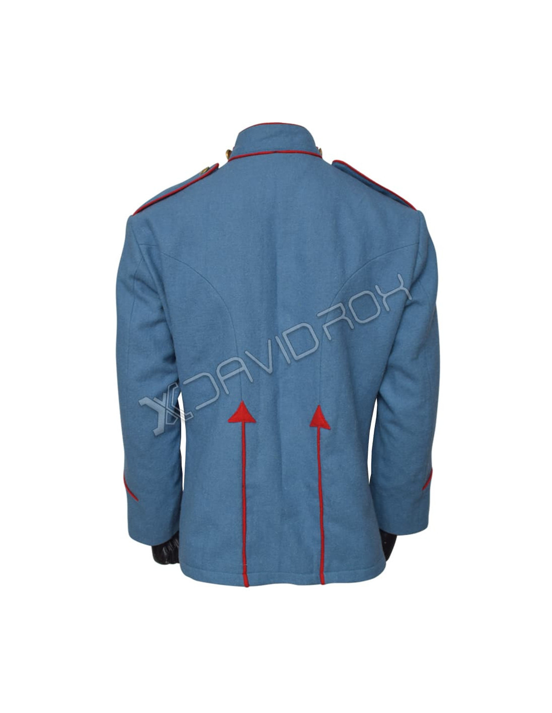 - Main Body, Collar, Cuffs, and Shoulders: Made of Civil War blue wool with striking red piping, brass finish buttons showcasing classic cadet aesthetics.