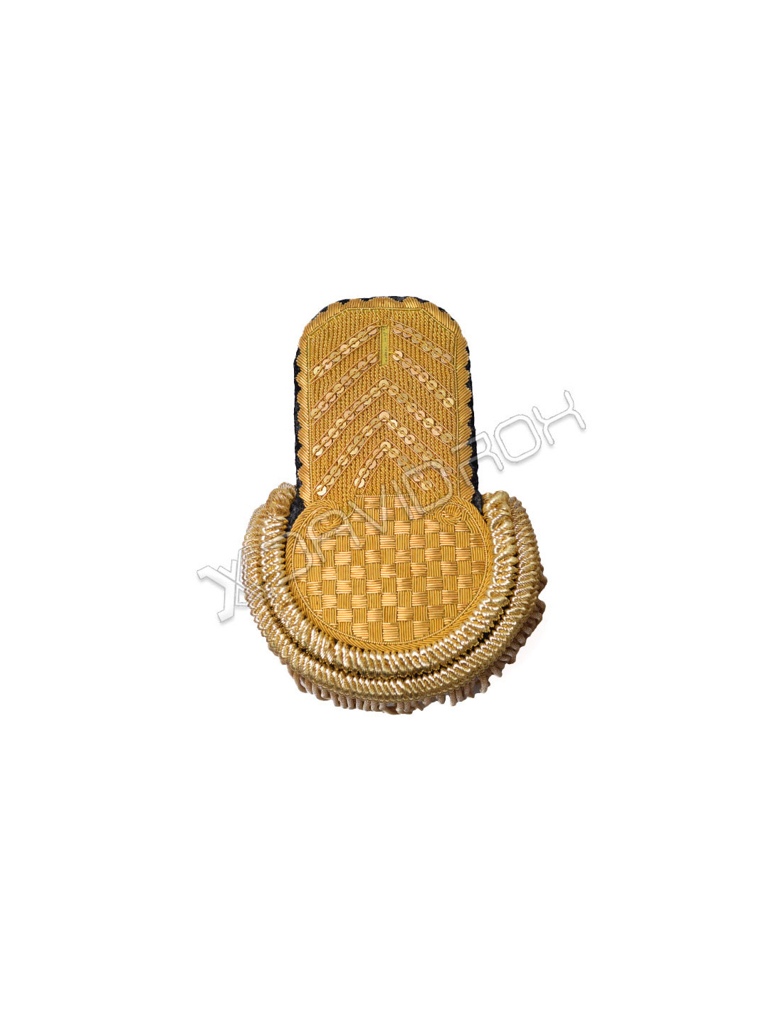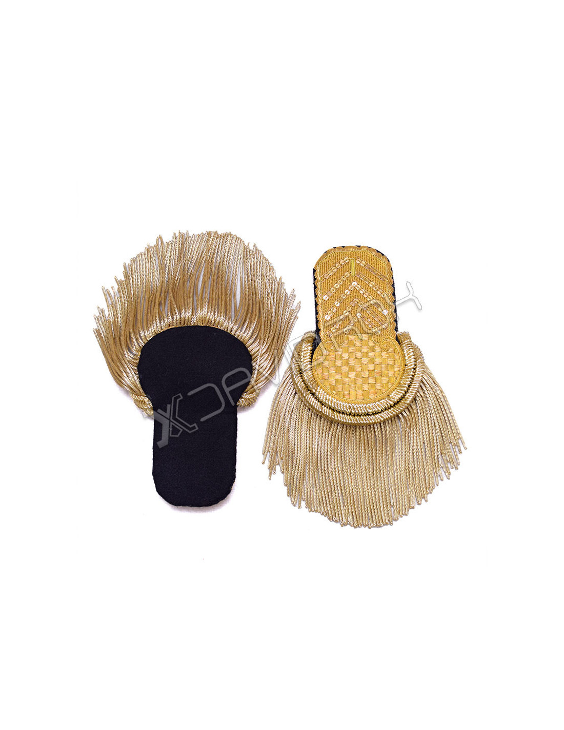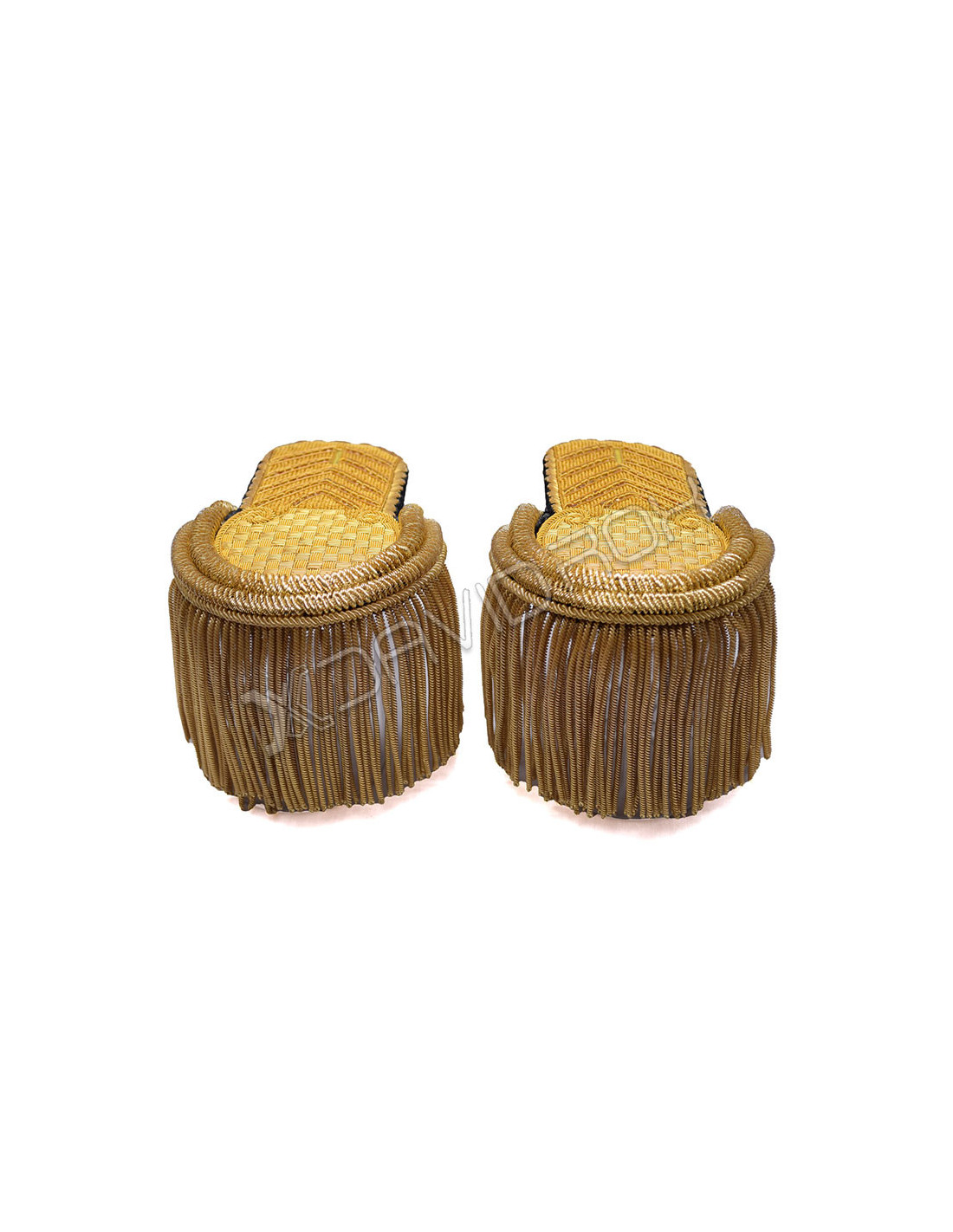 Gold Bullion Hand-Embroidered Officer Epaulettes. Pinnacle of opulence and craftsmanship, these epaulettes exemplify prestige, tradition, and leadership within military regalia.Material & Craftsmanship: