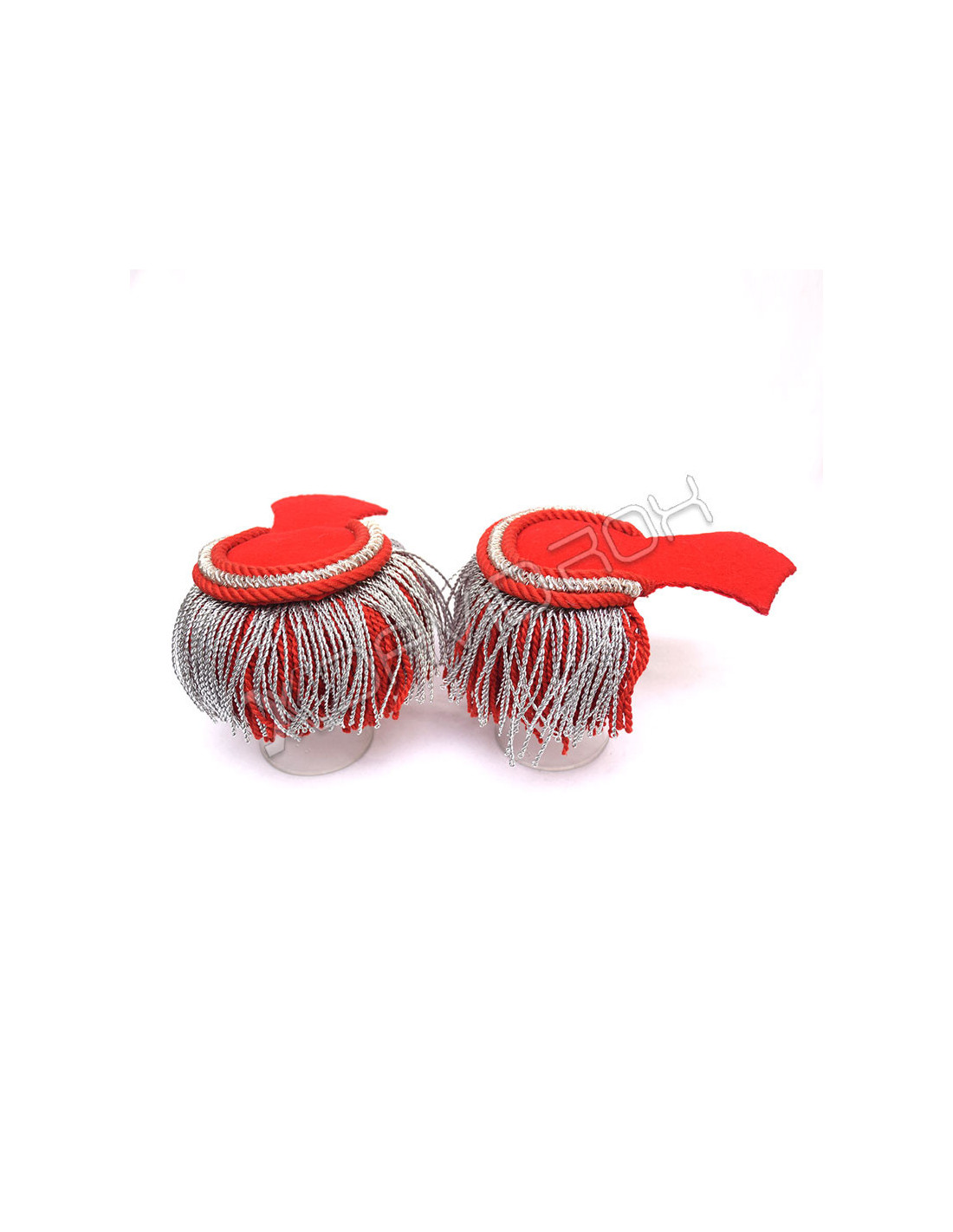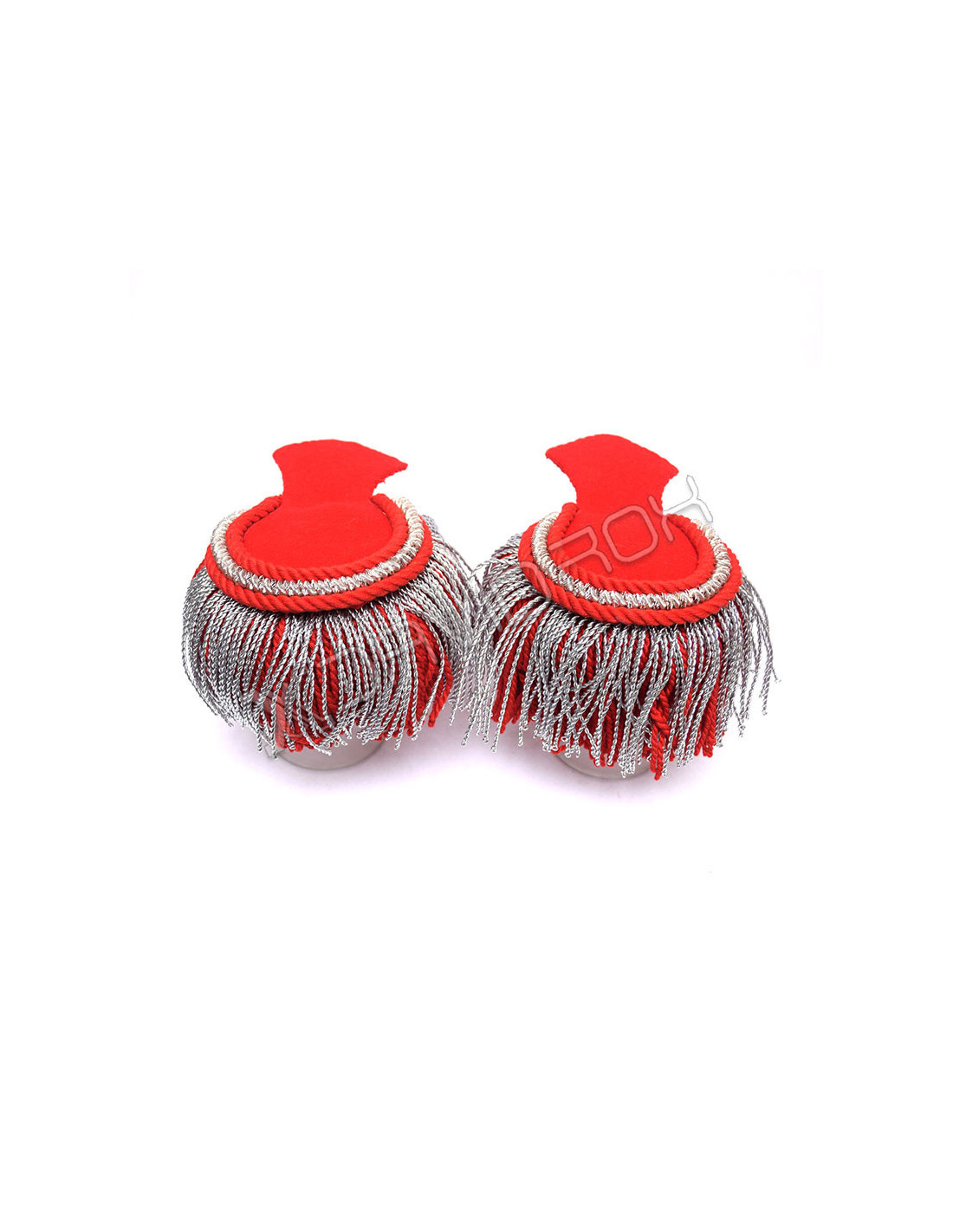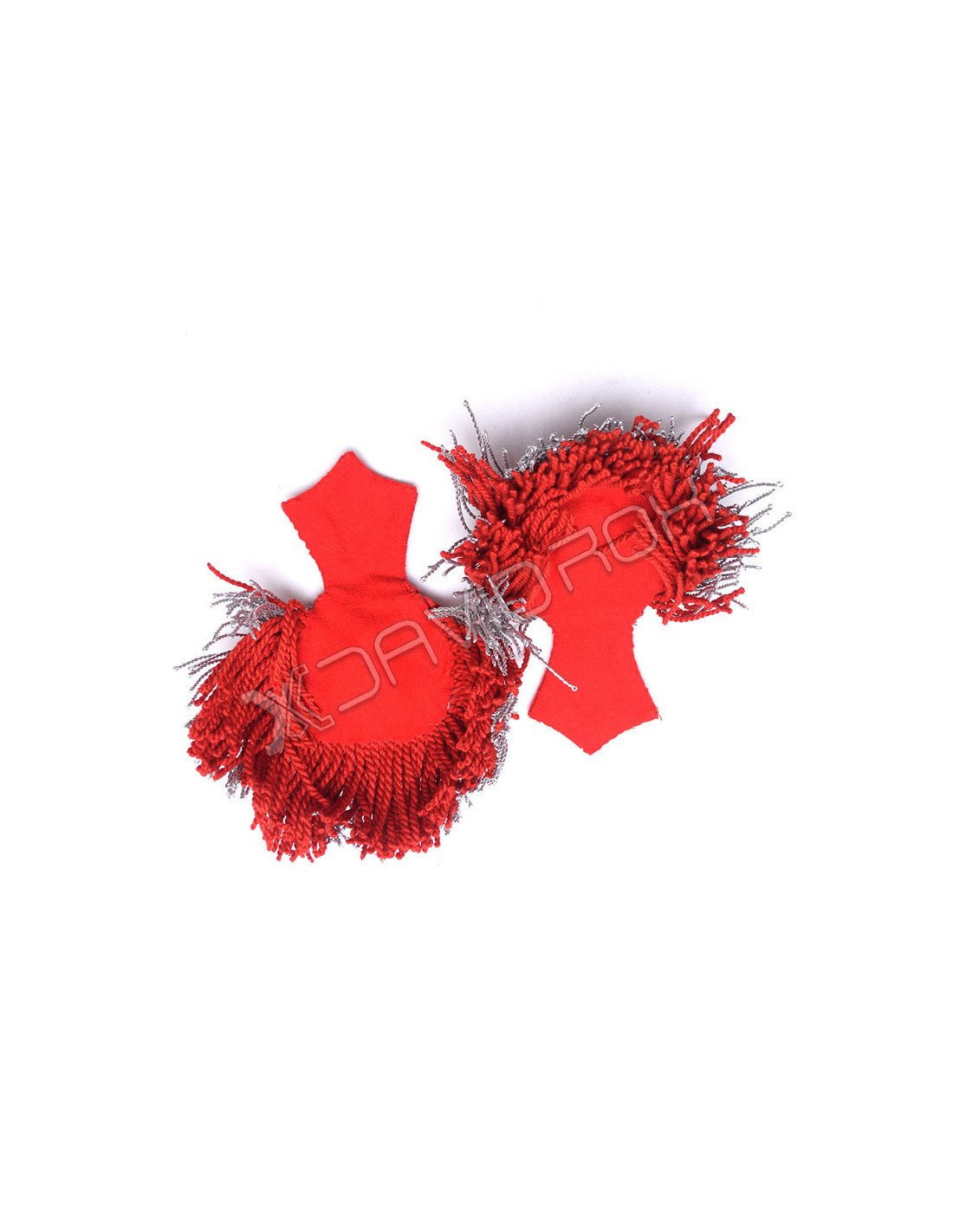 Red Silver Marching Shoulder Epaulettes. Vibrant and dynamic accessory, these epaulettes blend bold color with elegant detailing, enhancing marching band uniforms with movement and sophistication.
