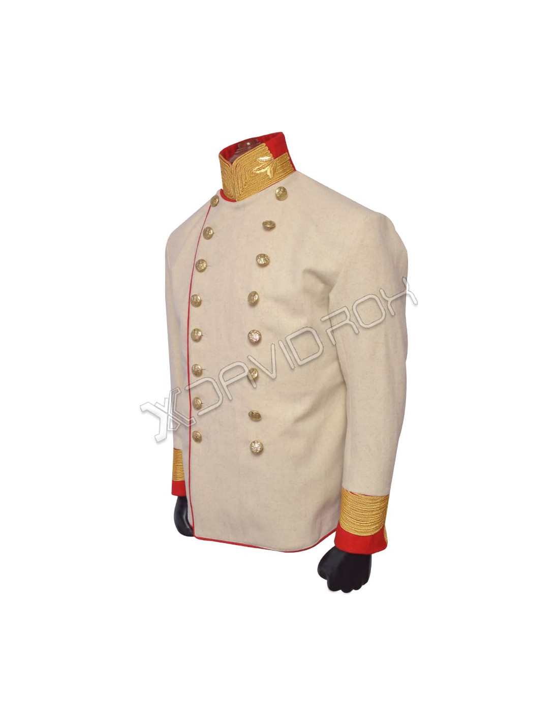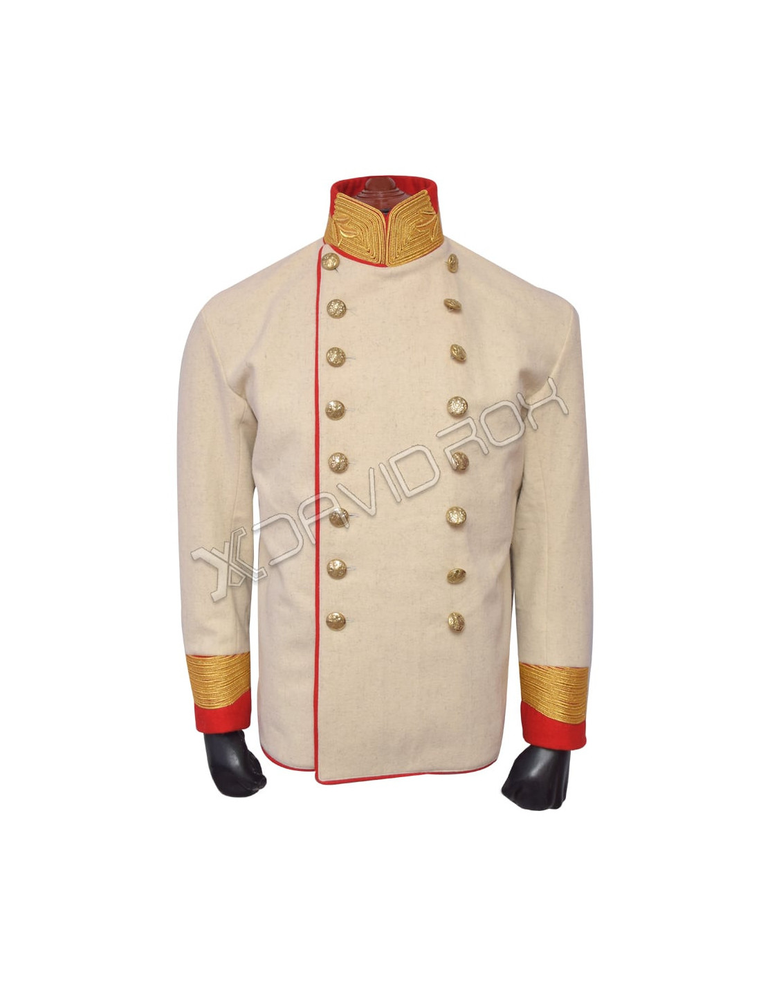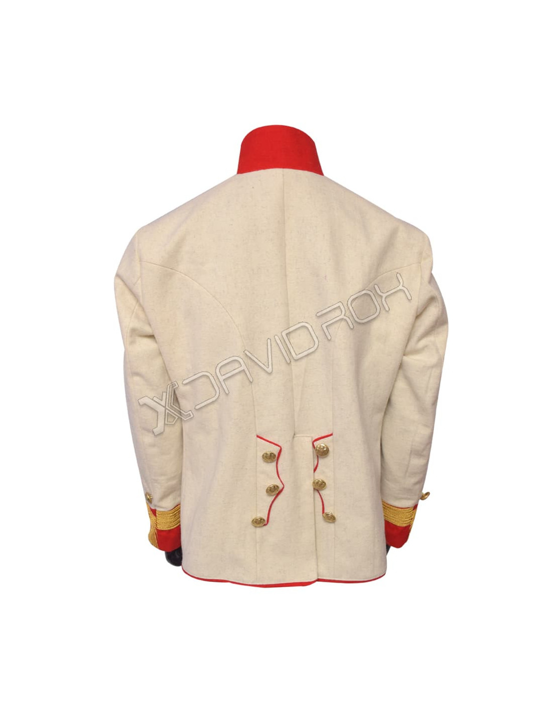 - High quality off white wool jacket with gold braid on red collar & cuffs and gold buttons.