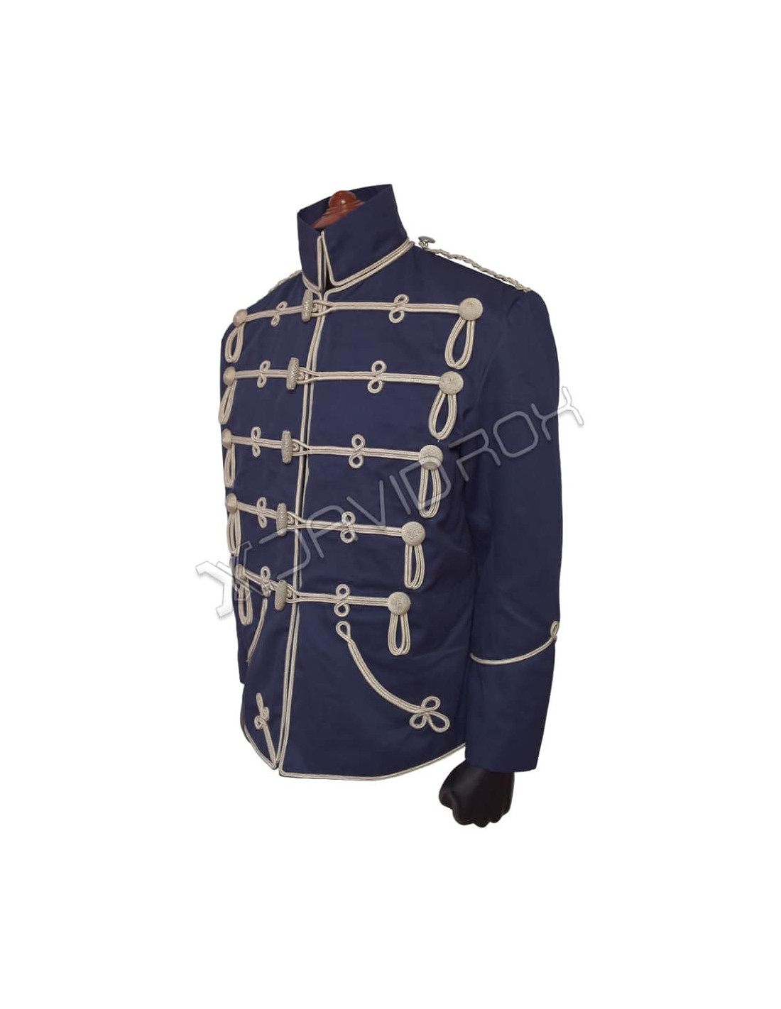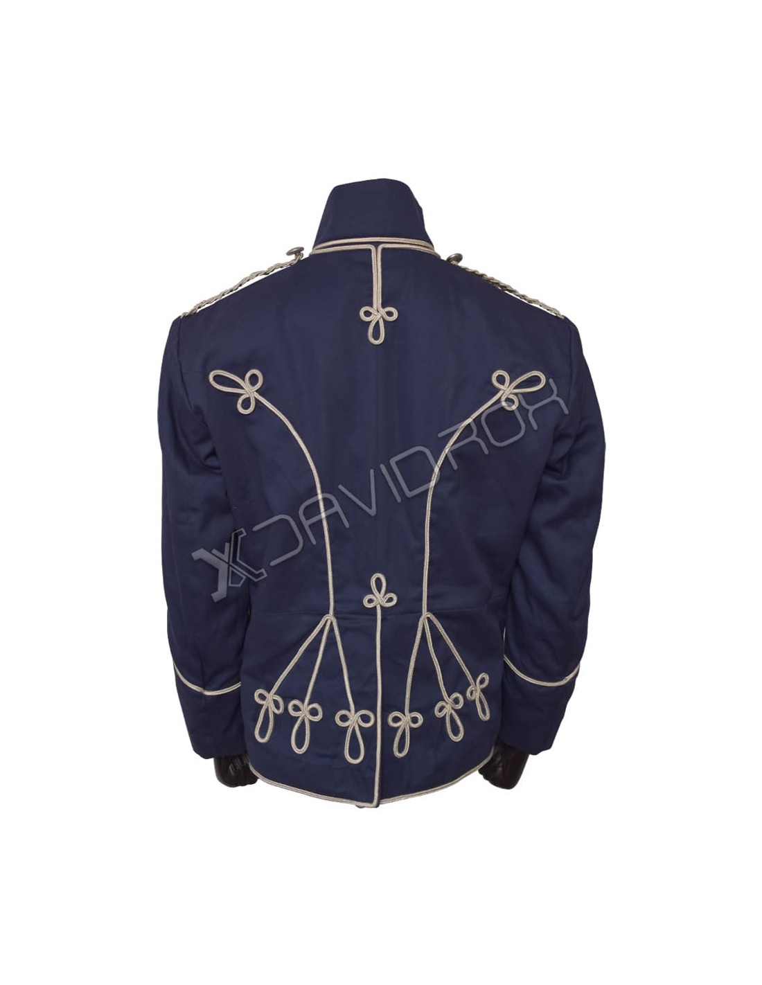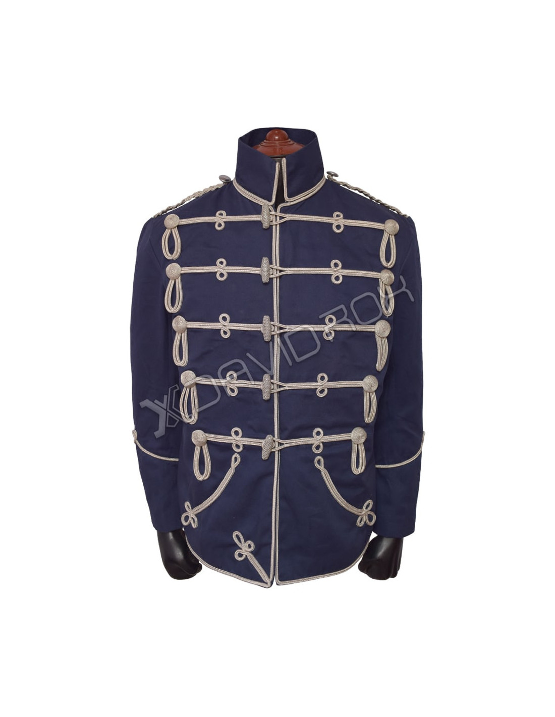 - Main Body: Crafted from medium dark blue heavy cotton, adorned with silver braid and buttons for a refined look.