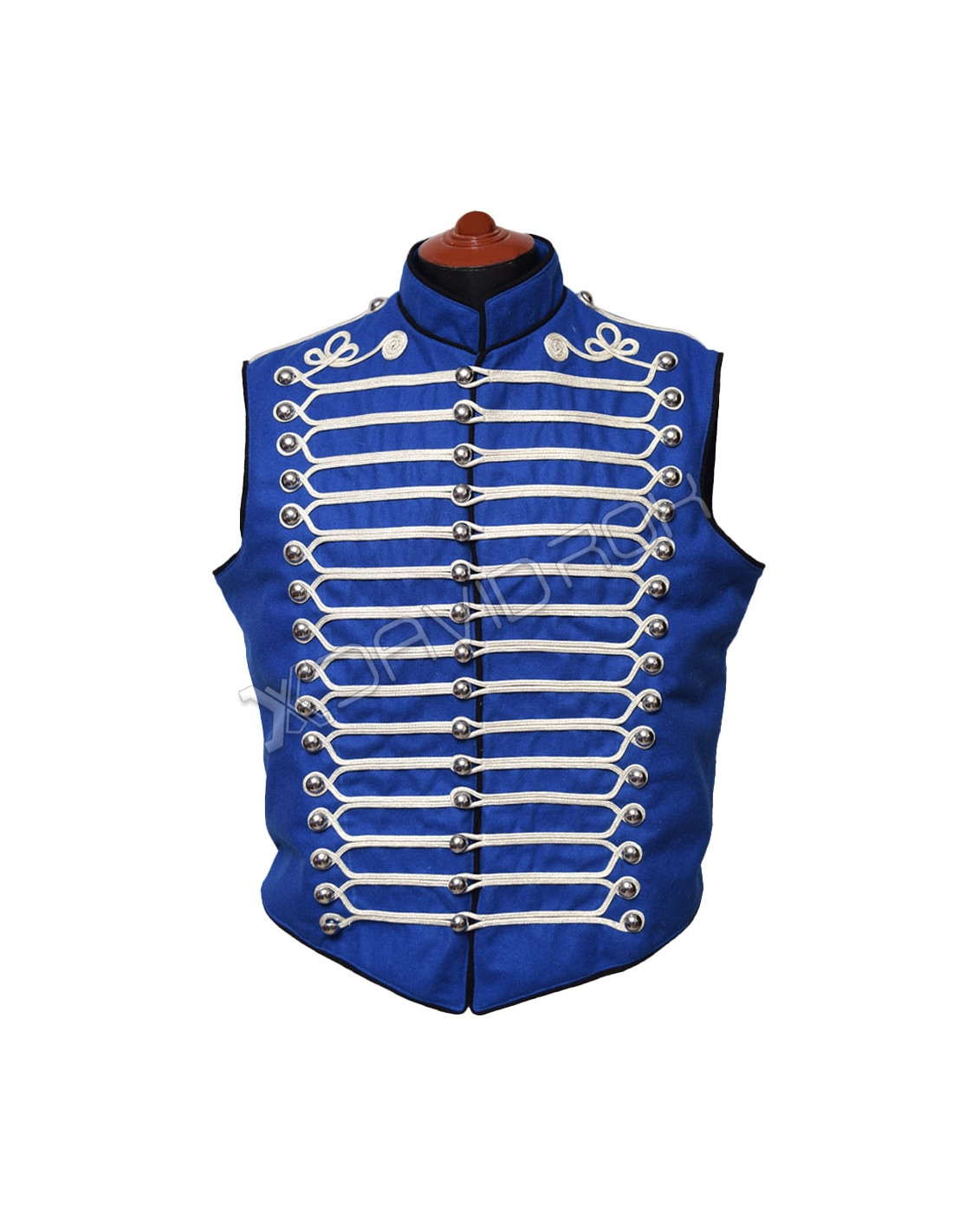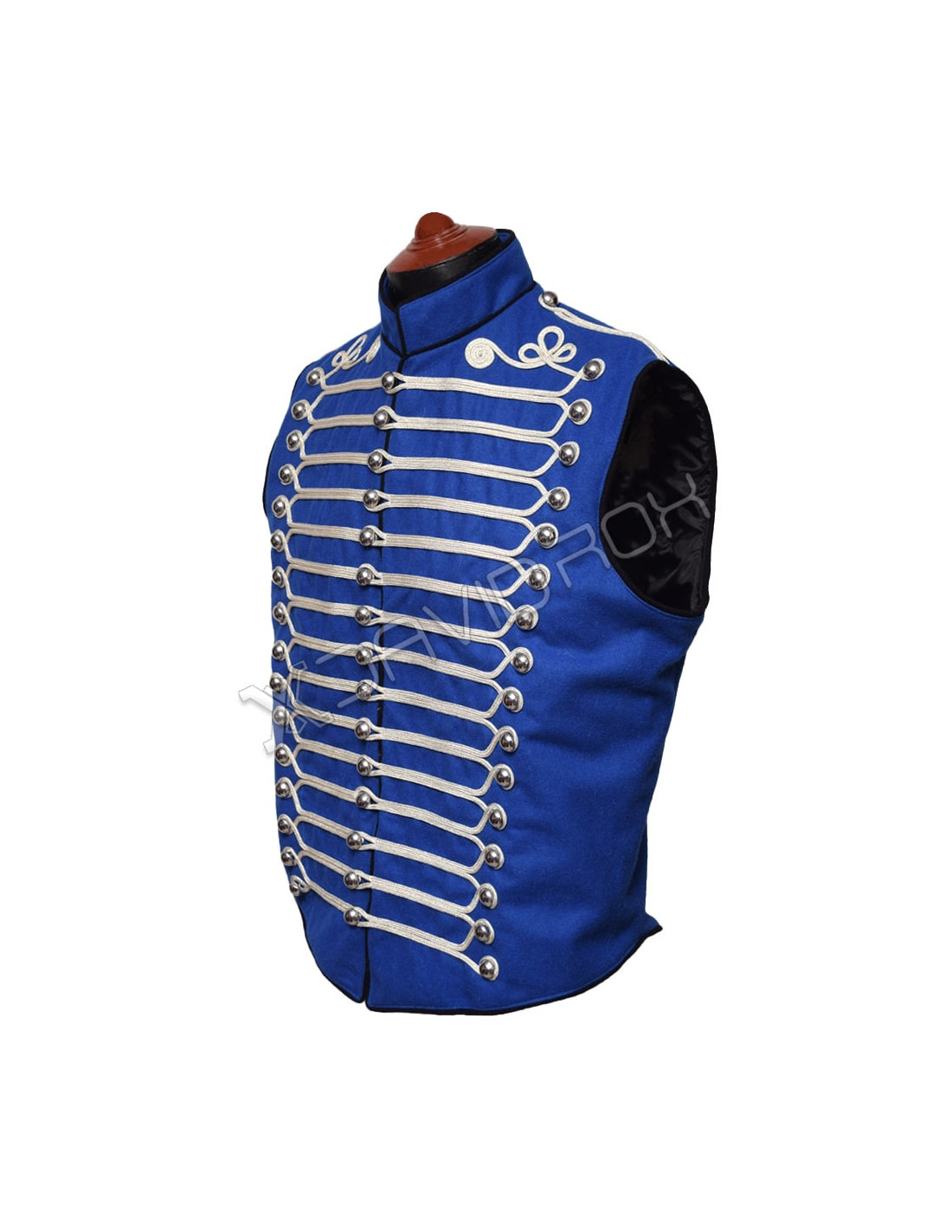 Men's Punk Drummer Parade Hussar Military Waistcoat. Bold fusion of punk-inspired aesthetics and traditional military craftsmanship, this Drummer Parade Hussar Waistcoat blends striking details with refined tailoring. Designed for collectors, performers, and fashion enthusiasts, it offers a structured yet commanding presence.