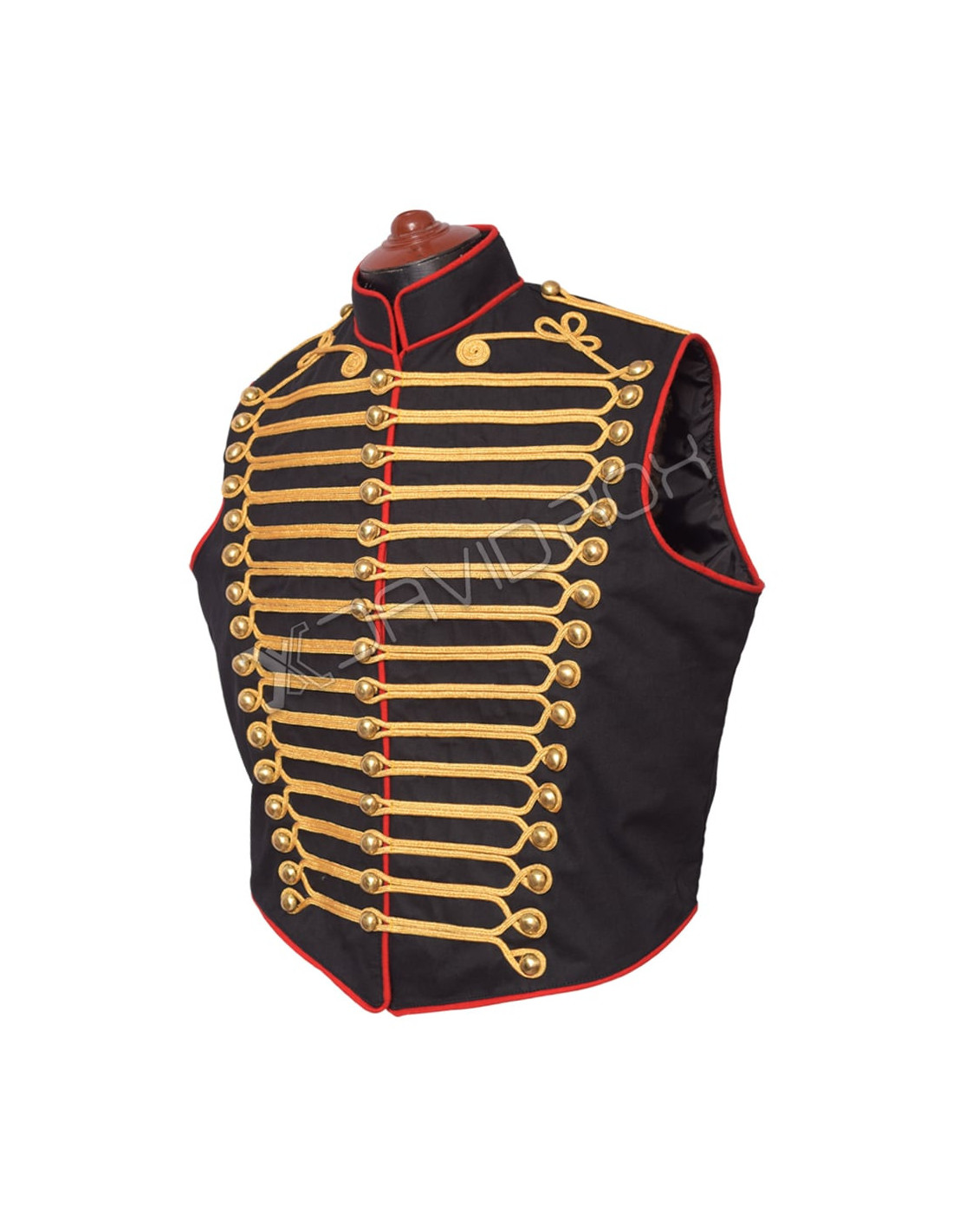- Braiding & Embellishments: Gold cord braiding on the chest and shoulders, complemented by golden brass buttons.